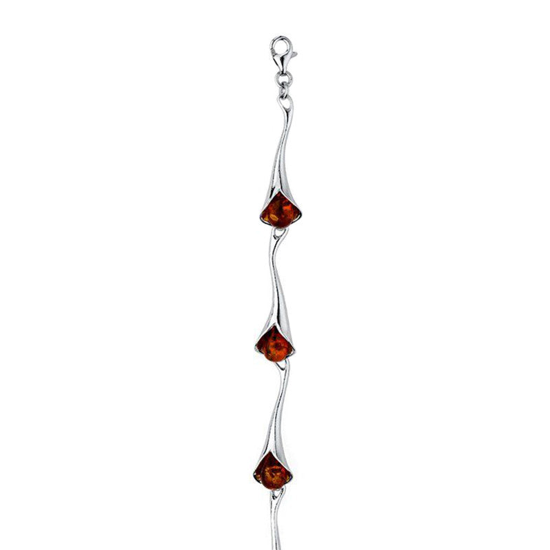 This sophisticated amber bracelet features long links of highly polished sterling silver which are gently curved to catch the light and give a feminine feel. Each link contains a carved amber section nestling in the open end to give added detail and a flash of colour. The bracelet measures a standard 19cm and the width of the amber is approximately 6mm at the widest.