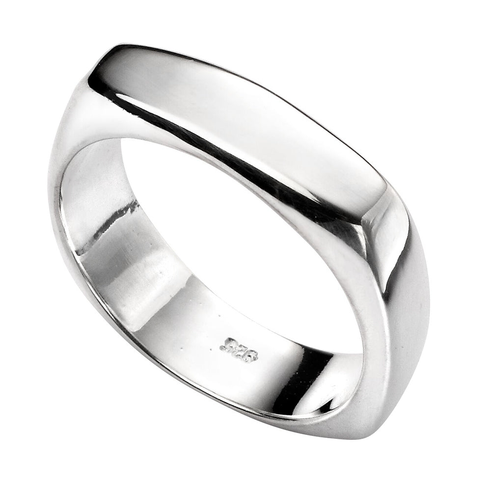 This ring is polished sterling silver and measures 5mm wide. This ring is beautifully rounded with flat edges and makes a perfect addition to any stacking rings.